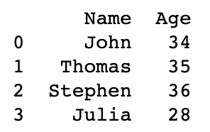 >>>data = {'Name':['John','Thomas','Stephen','Julia'],'Age':[34,35,36,28]}