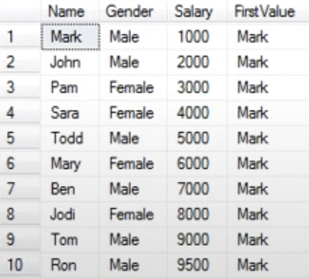 FIRST_VALUE(Name) OVER (PARTITION BY Gender ORDER BY Salary) AS FirstValue