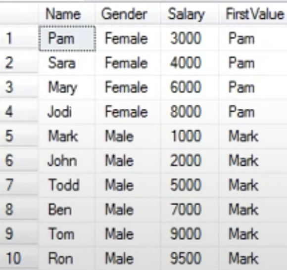 FIRST_VALUE(Name) OVER (PARTITION BY Gender ORDER BY Salary) AS FirstValue