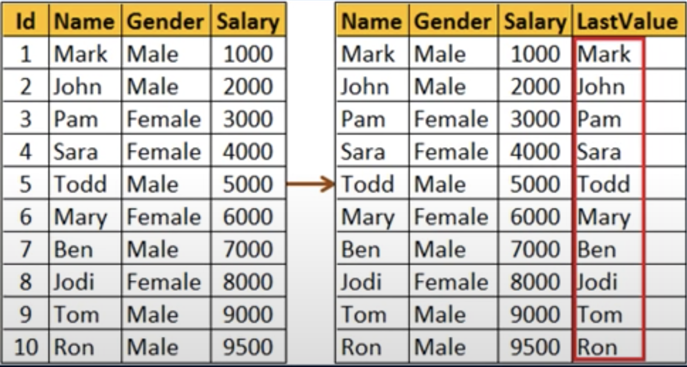 LAST_VALUE(NAME) OVER (ORDER BY SALARY) AS LASTVALUE